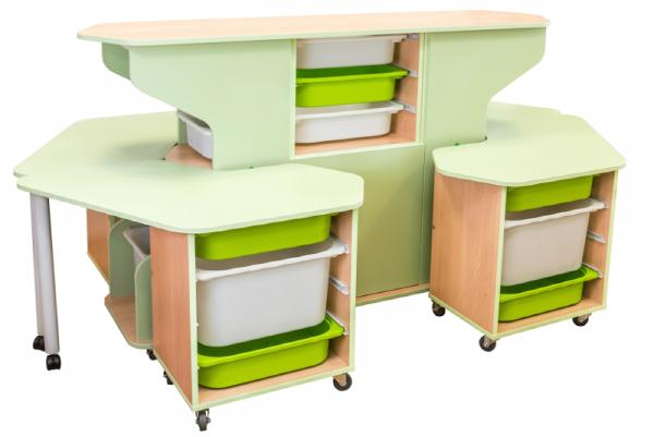 Модуль состоит из стеллажа и двух столов, левого и правого. Столики на колёсиках будет удобно подкатить к стеллажу или наоборот убрать. За данным модулем могут работать сразу несколько человек.