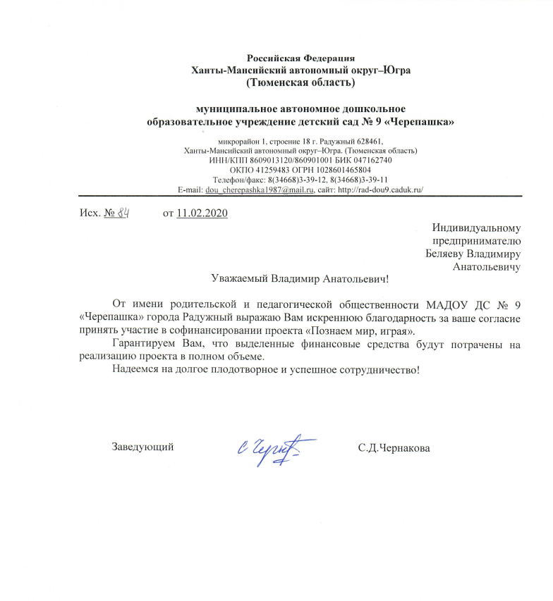 От имени родительской и педагогической общественности МАДОУ ДС №9 "Черепашка" города Радужный, выражаем вам искреннюю благодарность за ваше согласие принять участие в со финансировании проекта "Познаем мир, играя".