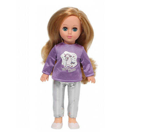 В комплект одежды входит: толстовка с наклейкой, где изображен танцующий единорожка, лосины из серебристого трикотажа. На ногах туфельки.