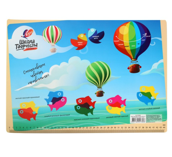 С цветным рисунком. Настольное покрытие прямоугольной формы с закругленными уголками, выполненное из мягкого пластика.