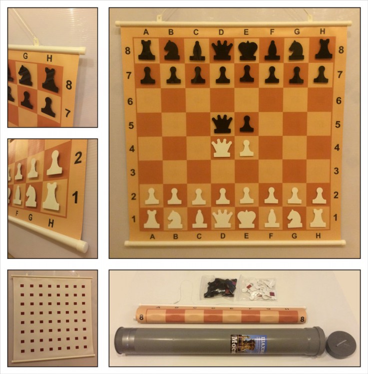 На обороте поля, в центре каждой его клетки, размещены магниты. При навеске магнитные фигуры примагничиваются к полям. Фигуры пластиковые магнитные (запасной ферзь и пешка).