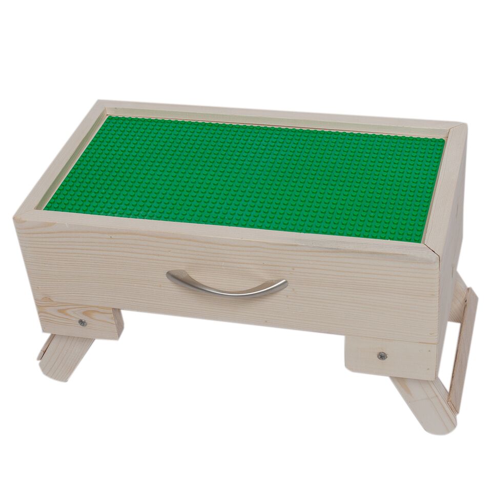 Крышка стола полностью выдвигается и имеет две поверхности: с полотном для работы с Lеgo Duplo, Friends, Creators , City, и обычную гладкую. Под крышкой стола спрятан вместительный ящик с четырьмя секциями, где можно хранить детали конструкторов или материалы для творчества и учебы. Рабочая поверхность стола обнесена бортиком для того, чтобы детали не падали на пол во время игр. За таким столиком можно разместиться как в одиночку, так и вдвоем.